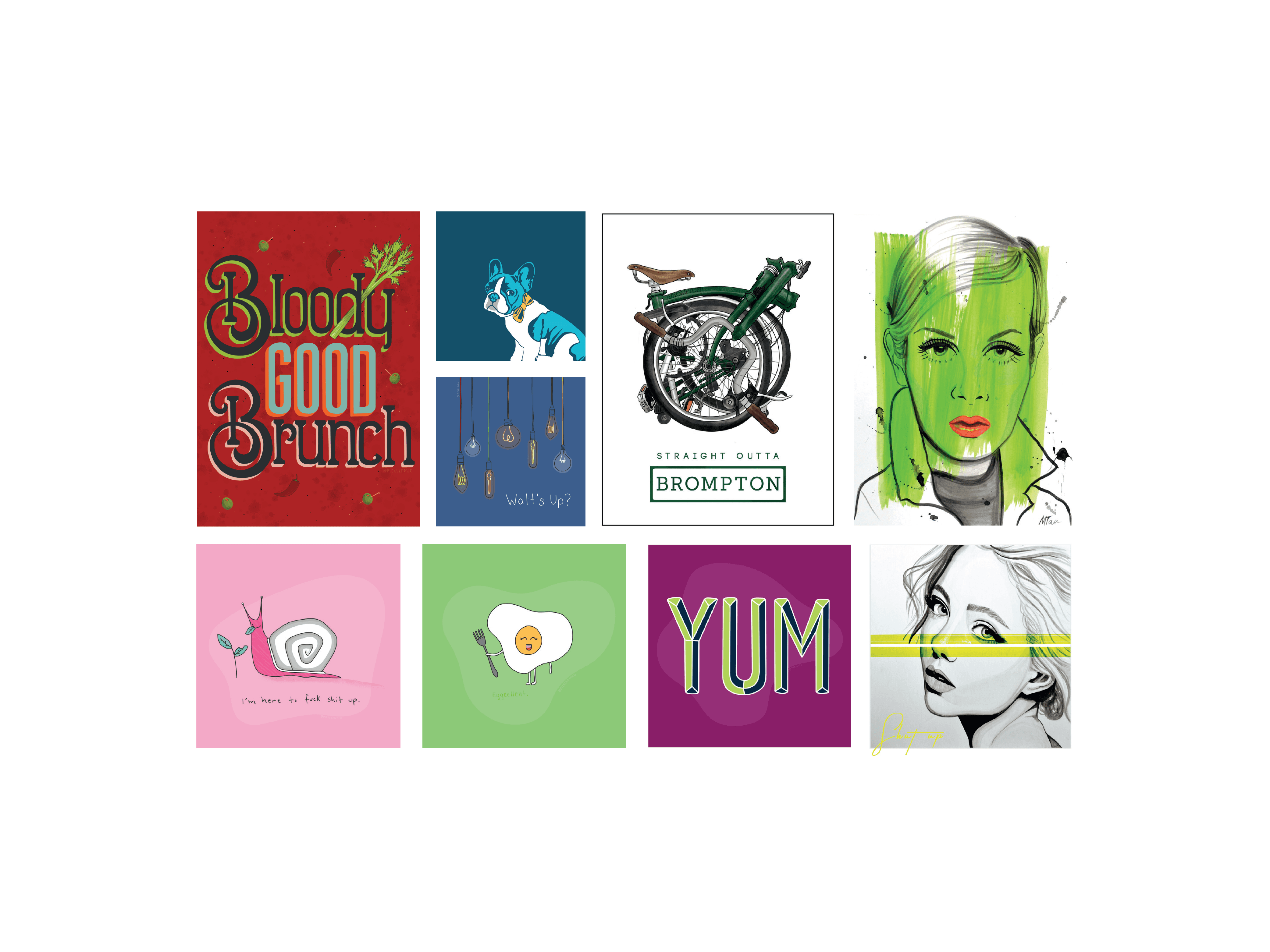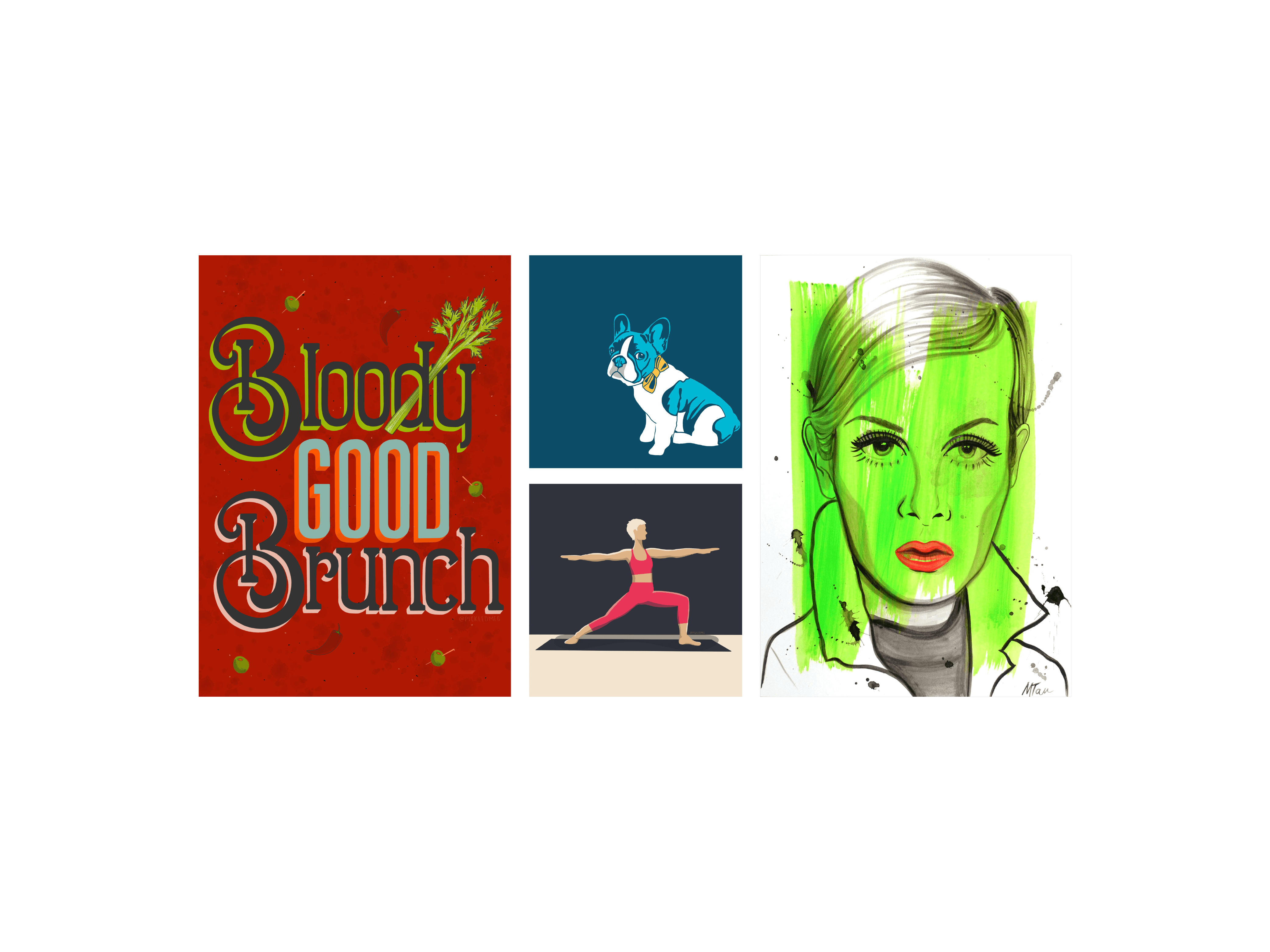 A selection of personal and commissioned illustration work spanning character design, typographic art, and fashion illustration — a showcase of creative range across styles and subjects